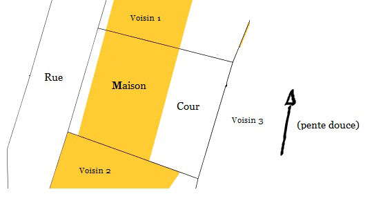 Le mur brut de parpaings est le mur qui sépare ma cour de celle du "voisin 1" sur la vue cadastrale corrigée et jointe à cette réponse (il y figure en rouge épais le cadre bleu délimite grossièrement les limites de la photo sur lequel vous l'avez aperçu).