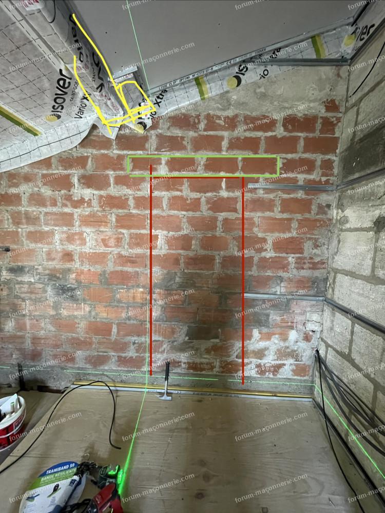 Sur la photo : en jaune, la position des poutres ; en vert, le linteau ; en rouge, l’ouverture.