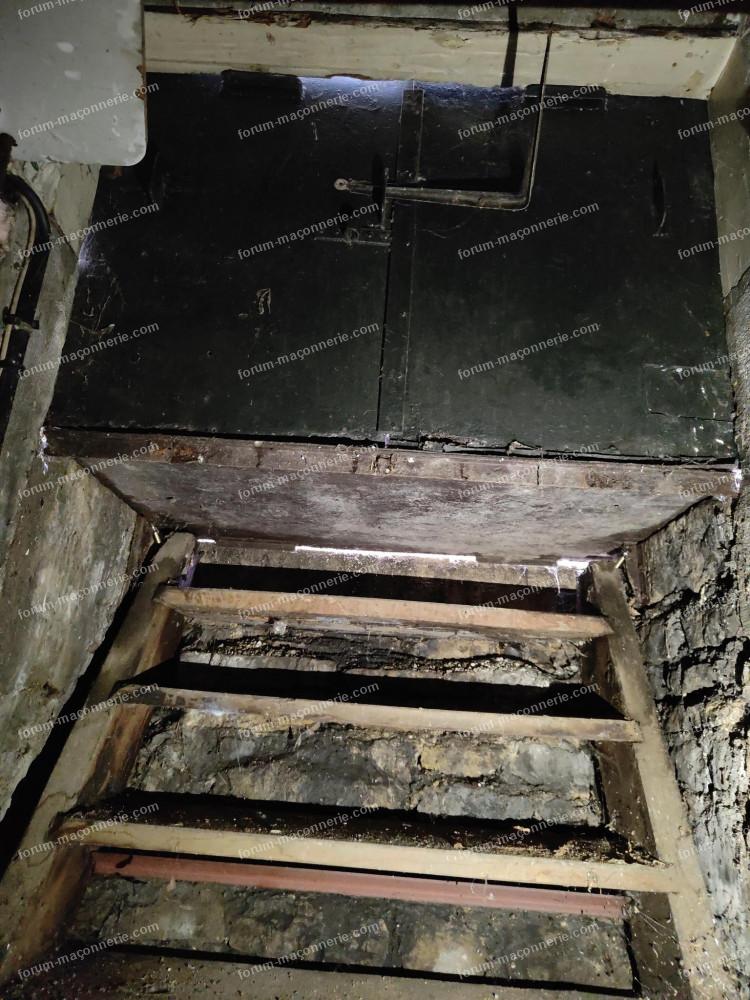 L'accès à la cave en sous-sol se fait par un escalier intérieur, et par ce qui me semble être une ancienne chute à charbon reconvertie en un escalier très raide, qui donne en dehors de la maison.